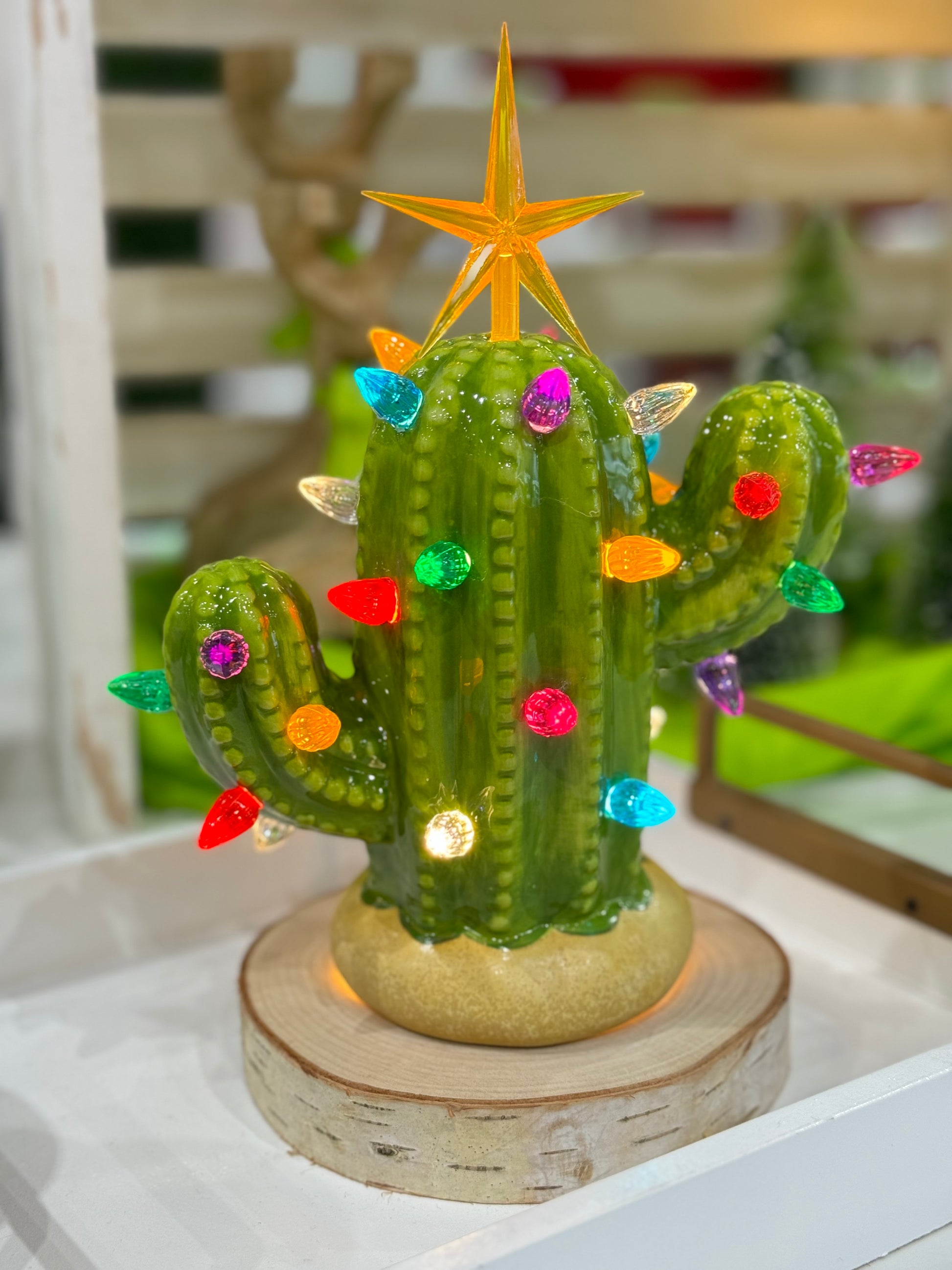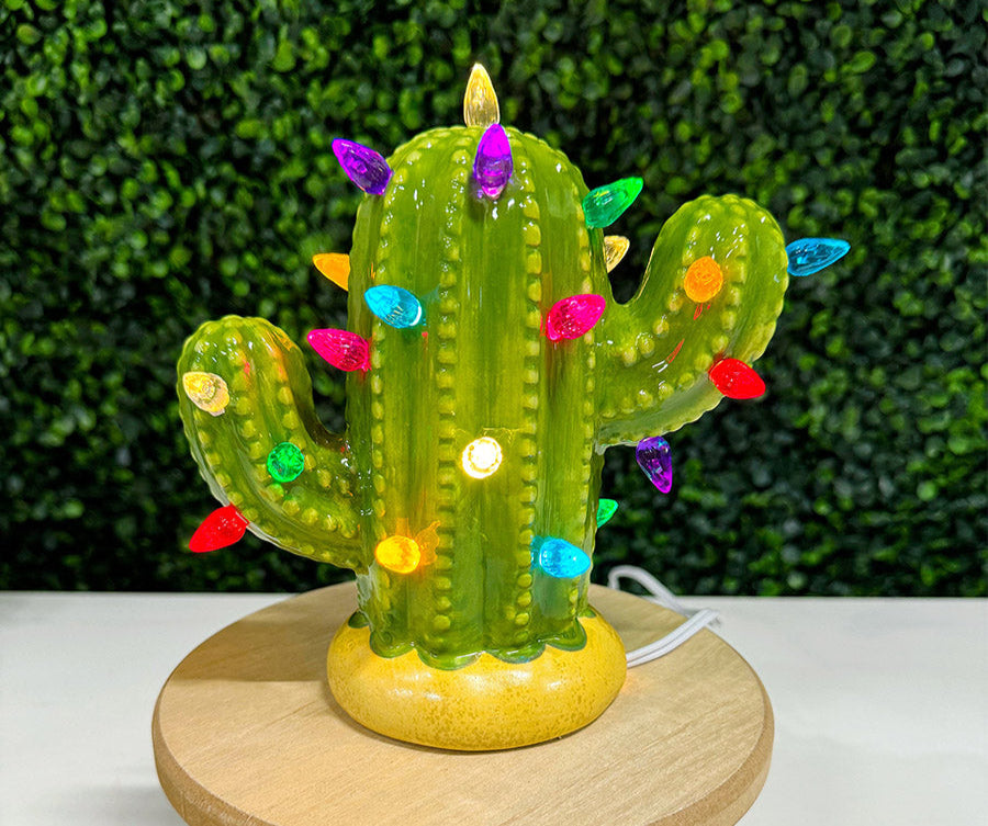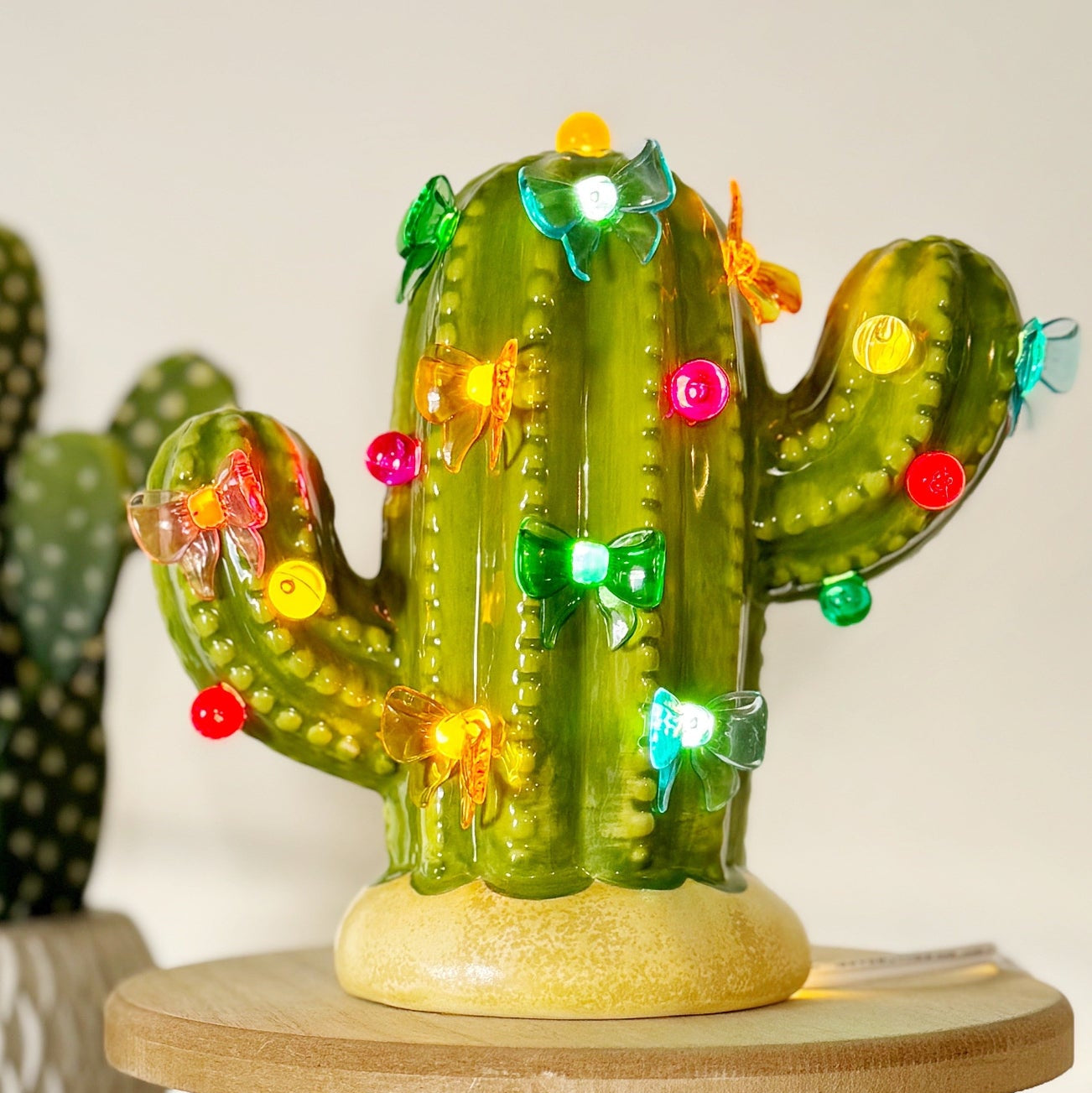 Meet the mini that packs a punch! Our Small Green Lighted Cactus Tree is the pint-sized version of our customer favorite—bringing all the Southwest charm and nostalgic glow in a smaller, giftable size. Hand-painted in our signature cactus green glaze and topped with a glowing white star, this little cutie lights up with colorful pegs you can swap out for every season.