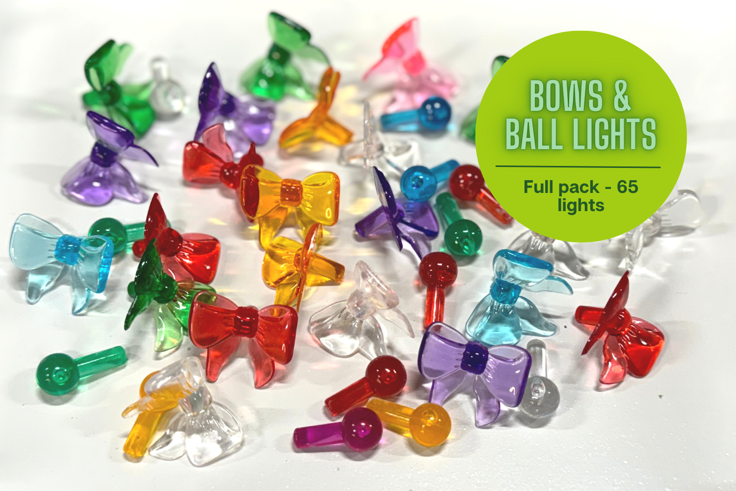 Light pack includes 65 total mix of multi color bows and small pin ball lights to add to any size ceramic tree.