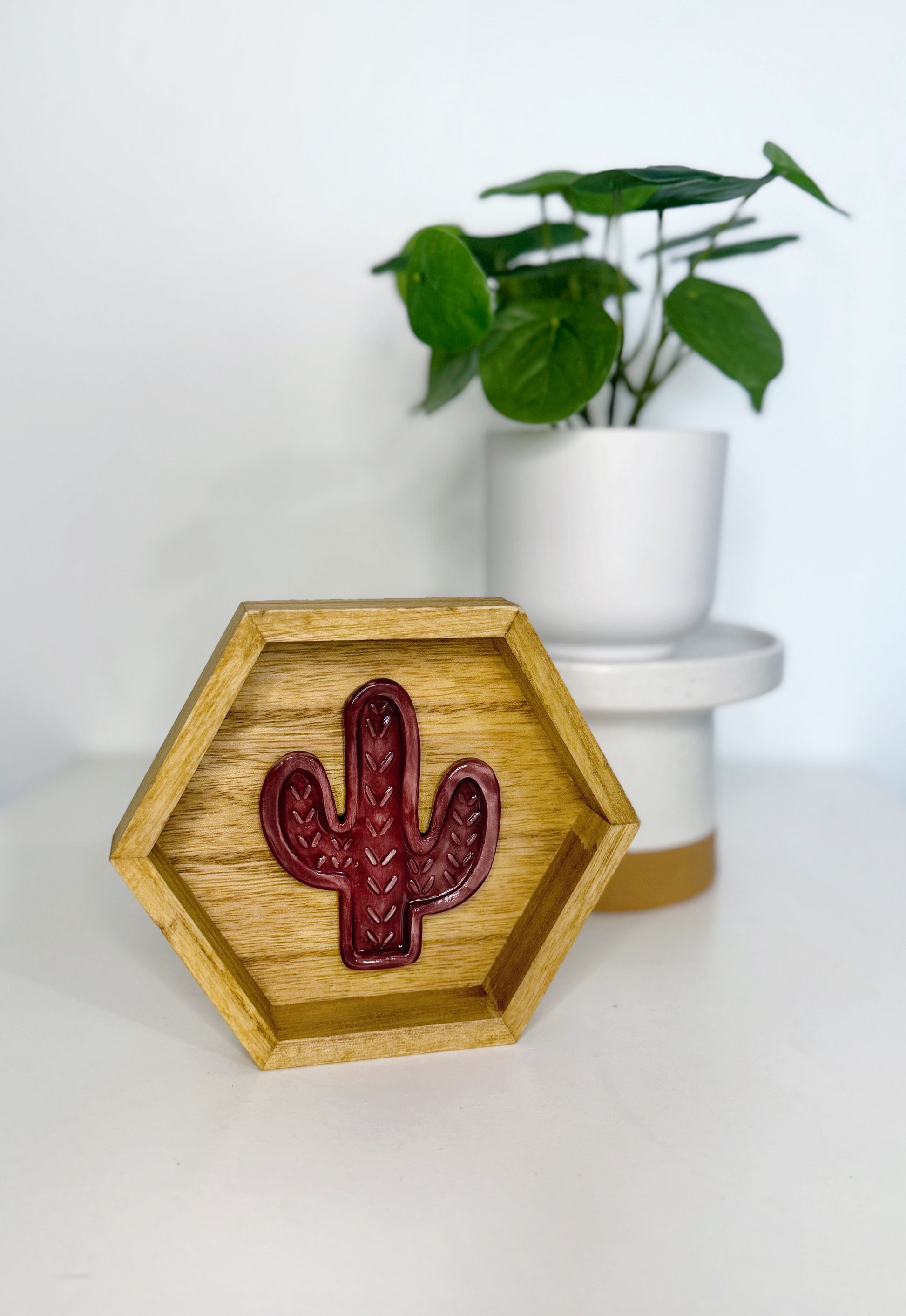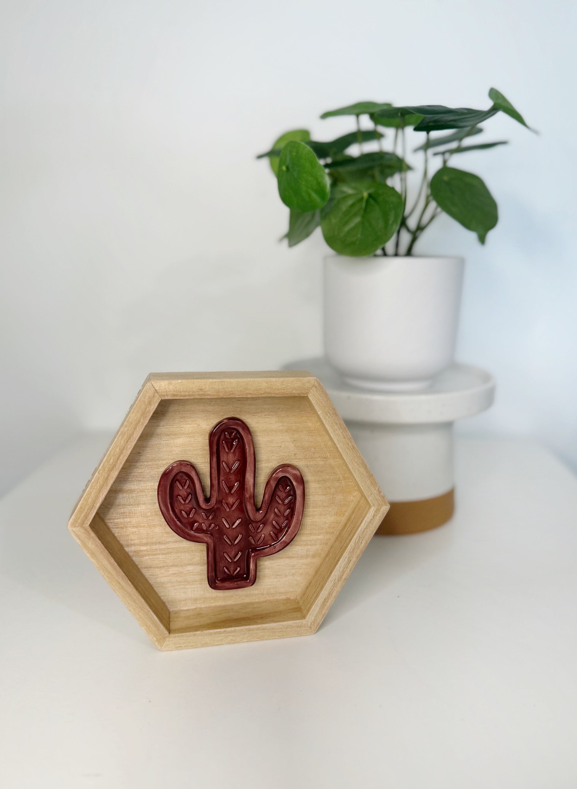 Brighten up any space with this charming hexagon ceramic cactus wall art. Featuring a hand-painted ceramic cactus in vibrant colors, this unique piece is nestled inside a hexagon wood frame, adding a touch of desert flair to your decor.