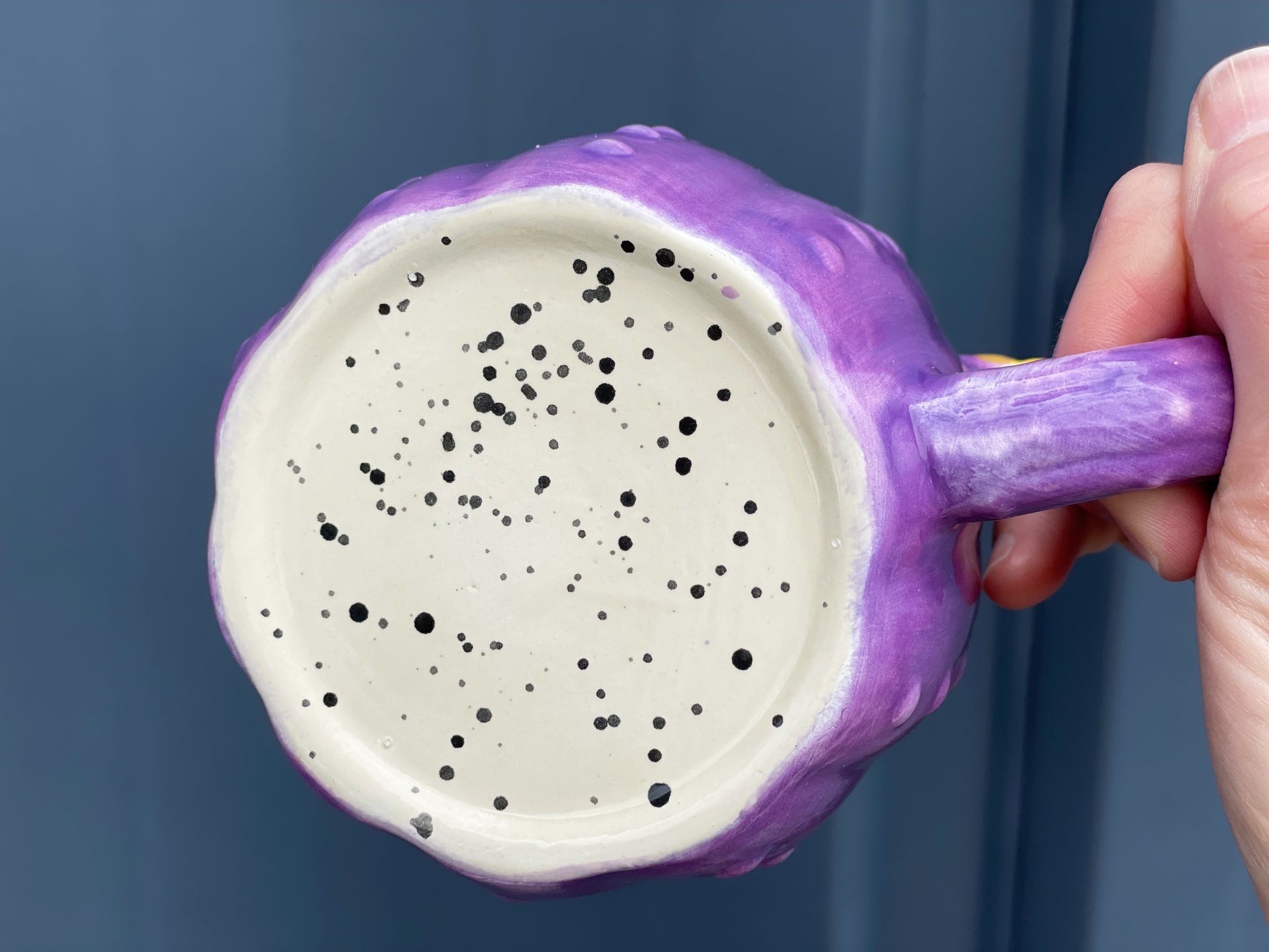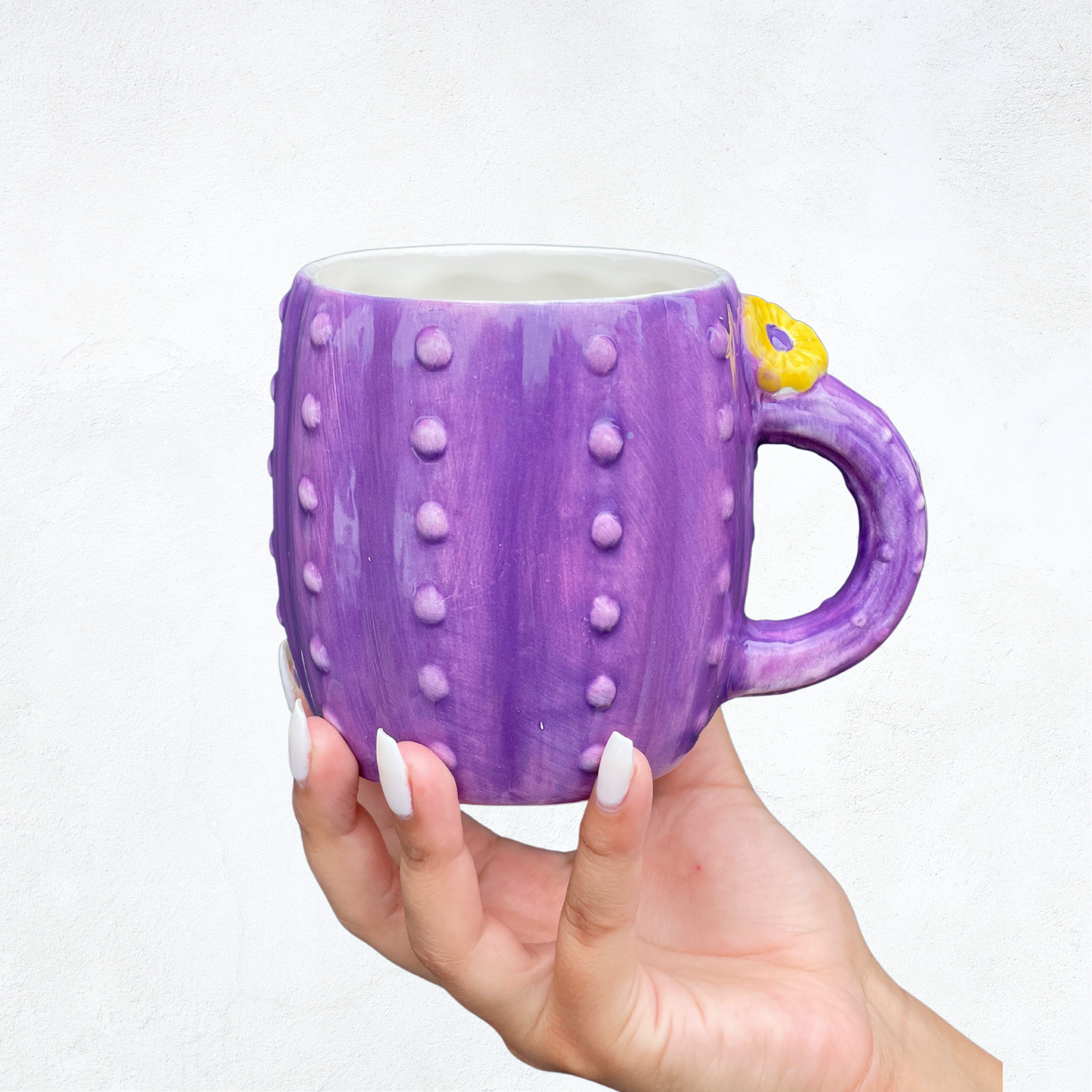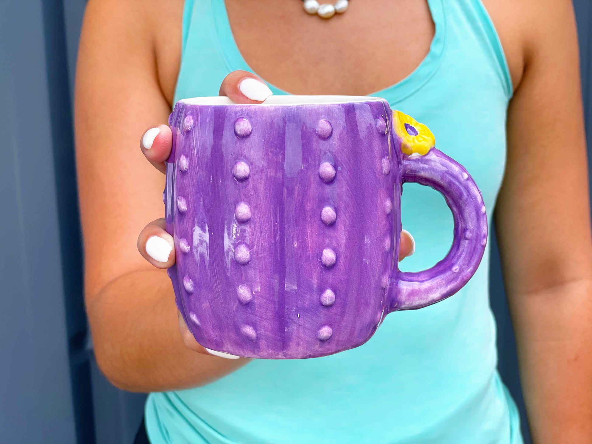 This 16 oz mug is hand painted with a two tone dimensional purple glaze. Dark purple under tone with bright purple over top. Bottom base in faux cactus sand for that extra little pop when you lift your cup. This unique, custom design appears vintage and watercolor painted.