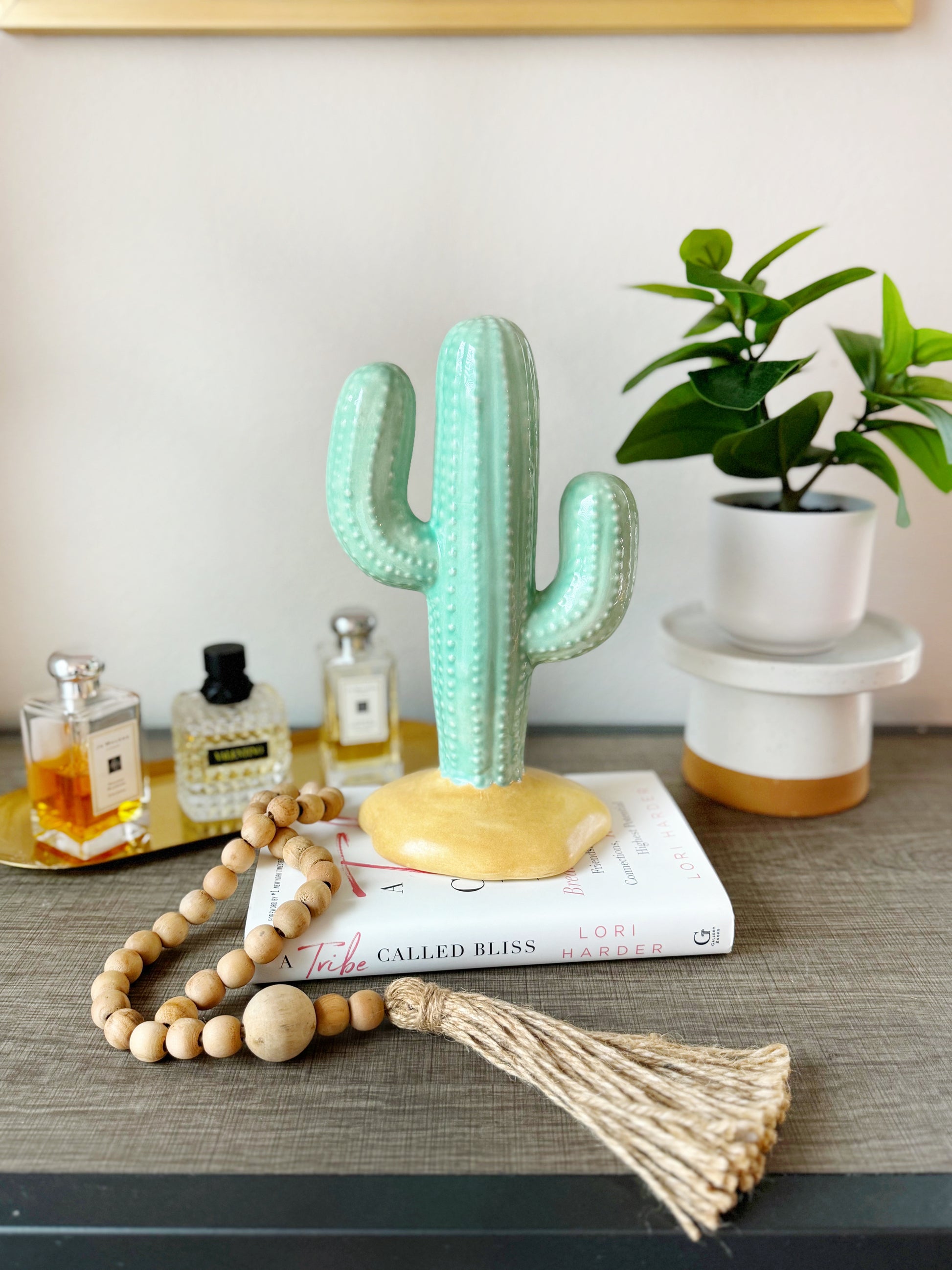 Add a touch to charm to your home with this vintage ceramic cactus tree sculpture in a stunning mint sea glass green glaze.