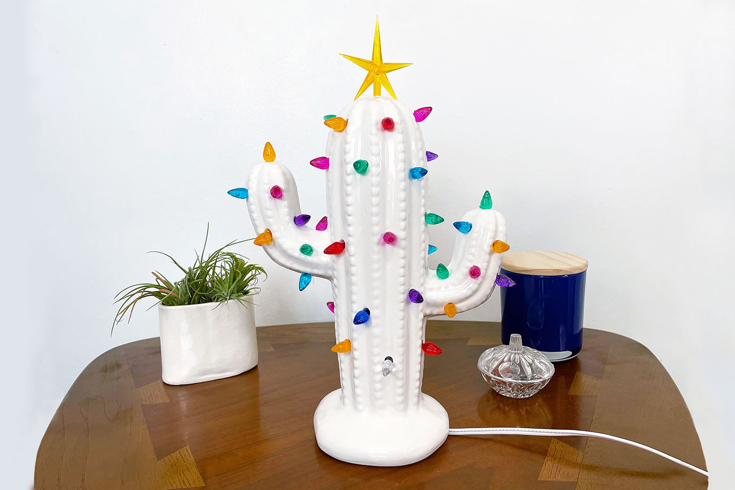 WHITE Lighted Ceramic Christmas Cactus. A sweet twist on our popular green cactus. Perfect for Holiday home decor.